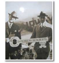 Their solution was to host a Grand Opening Party and repeat it three days in a row. This photo shows the gentlemen from the Arizona Biltmore Corporation (John Gage & John McAtee Bowman) holding the wooden key and the bouquet of roses that were dropped by the Scenic Airways plane that would fly over the hotel.